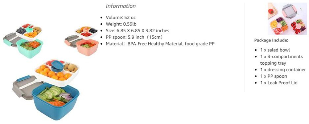 - Large Capacity – Three PCS 52 OZ bowl, 2 OZ dressing container, 3 divided removable tray. Perfect capacity for your daily work, camping, outdoor, kids and adults. A great choice for your family, husband, wife, children.