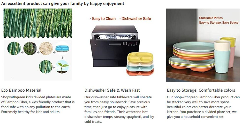 • Great Bamboo Divided Plates - Made from durable bamboo fiber, corn starch, blend with food grade melamine. BPA Free, great for both kids adults.