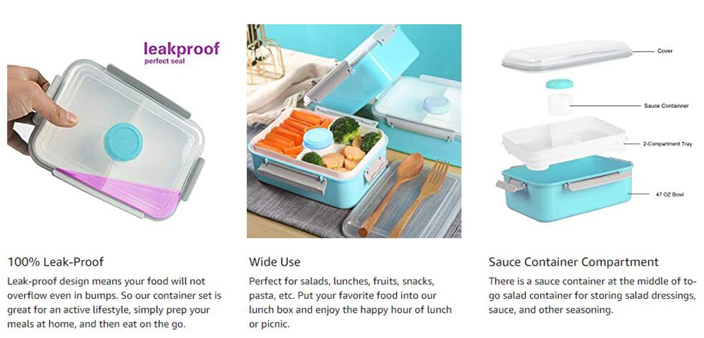 - Sauce Container Compartment: There is a sauce container at the middle of to-go salad container for storing salad dressings, sauce, and other seasoning